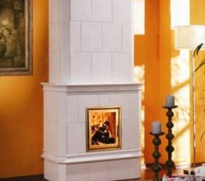 Piec kaflowy gładki, wykonany z białych kafli z delikatnie zarysowaną koroną. Wewnątrz możliwy do zamontowania piec kumulacyjny lub wkład kominkowy z nasadowymi krążkami kumulacyjnymi.