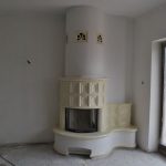 Kaflowy kominek z asymetryczną półką po prawej stronie. Zabudowa z płyty w górnej części została sprytnie dobrana do reszty kształtu obudowy kaflowej. W górnej części kafle ażurowe.