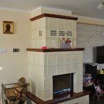 Kominek na ścianie prostej z kafli gładkich połączonych dwóch kolorach szkliw. Kominek z szybą prostą przesuwaną do góry zapobiega wydostawaniu do dymu do wnętrza pomieszczenia.